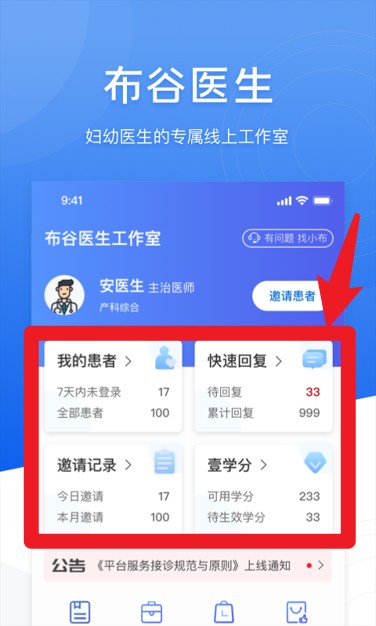 2、进入布谷医生工作室主页后,可查看我的患者、快速回复、邀请记录和壹学分等模块。