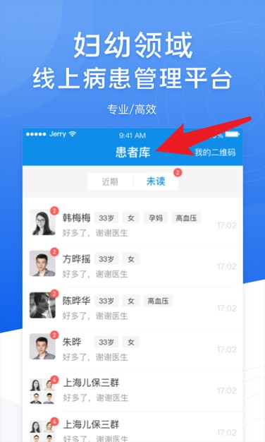 3、患者库界面支持查看未读消息及患者资料,帮助医生实现妇幼病患高效线上管理。