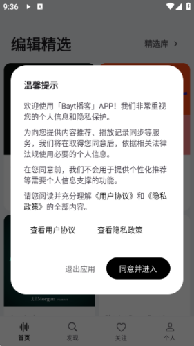 1、同意协议进入应用:在温馨提示弹窗中点击“同意并进入”,进入Bayt播客APP首页。