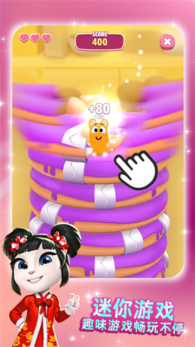 游戏中着很多的小游戏,安吉拉可以在房子里畅玩各种全新的迷你游戏,不仅有寻找疯狂的谜题和古怪的虫子,还有甜甜圈旋转等更多的宠物游戏和古怪的猫咪游戏等着你带她去体验,极大地丰富了游戏的可玩性。而且因为是第二代作品嘛,所以在这里除了公寓的一切新鲜事物,我们的安吉拉还可以到户外探索啦!她希望能够得到你的帮助,满足她的日常所需,梳洗打扮,选一身完美的行头、化妆和选择有趣的消遣活动!