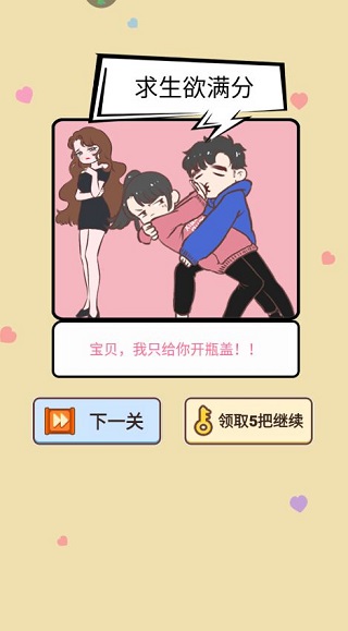 情侣求生欲游戏手机版是一款让恋爱关系瞬间变成爆笑闯关现场的益智解谜游戏,当情侣们陷入日常相处的微妙时刻,往往一句话、一个眼神就能决定今晚是睡床还是睡沙发,而游戏精准捕捉了这种令人窒息的紧张感,玩家将化身一位时刻游走在分手边缘的男朋友,面对女朋友层出不穷的灵魂考验,前任突然发来的好友申请、逛街时对美女的无意一瞥、忘记纪念日该送什么礼物,每一个选择都暗藏杀机。情侣求生欲游戏手机版用卡通画风和夸张音效消解了现实中的紧张感,让玩家在捧腹大笑的同时恍然大悟,原来恋爱中的那些送命题换一个角度竟是如此可爱的瞬间,情书系统允许玩家自由组合甜言蜜语,不同的遣词造句会导向截然不同的剧情走向。游戏还埋藏了大量隐藏结局,细心呵护女友的好好先生能解锁求婚成功的甜蜜彩蛋,而屡教不改的直男玩家可能会收获单身快乐的特殊成就。