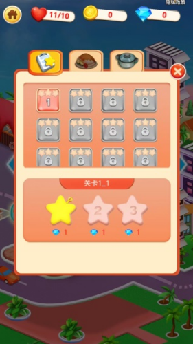 1、登录进入游戏,玩家首先从已经解锁的第一关卡开始体验,初期优先升级核心烹饪设备,提高翻台率。