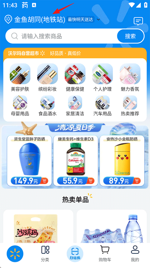 1、打开沃尔玛App网上购物商城,在首页点击左上角的定位进入。