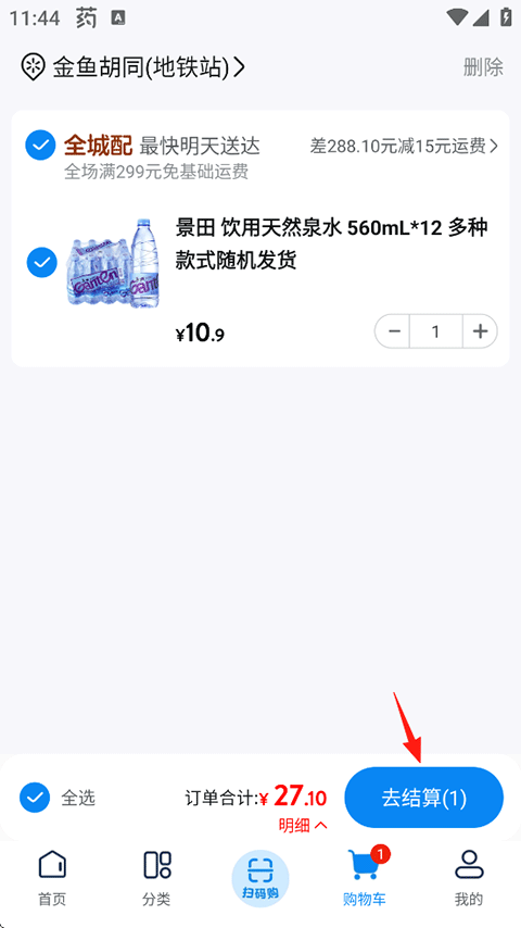 6、点击“购物车”确认购买商品,再点击“去结算”。