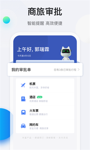 2、智能审批流程:移动端发起差旅申请,自动匹配企业差标并跟踪审批进度。