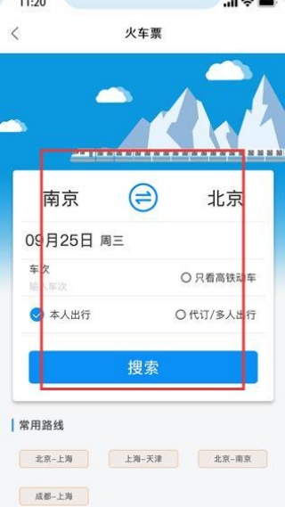 2、火车票预订界面,选南京北京、日期,设出行方式,点搜索查车次;