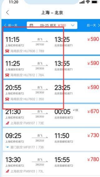 3、机票列表界面,呈现上海北京航班,含时间、价格、航班信息,方便购票;