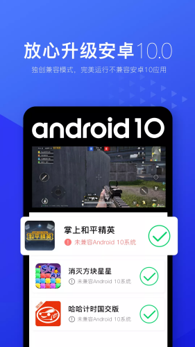 独创兼容模式,完美运行不兼容安卓10的应用,在安卓10手机上完美运行掌上和平精英、同事APP、单机游戏。