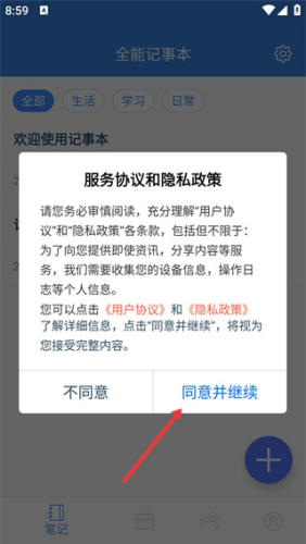 1、在本站下载安装点击打开进入app,首先需面对服务协议和隐私政策弹窗,点击同意并继续才能进入。