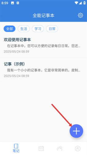 2、进入全能记事本主界面后,底部有笔记分类选项,点击右下角加号可创建新记事,您可以自行记录。