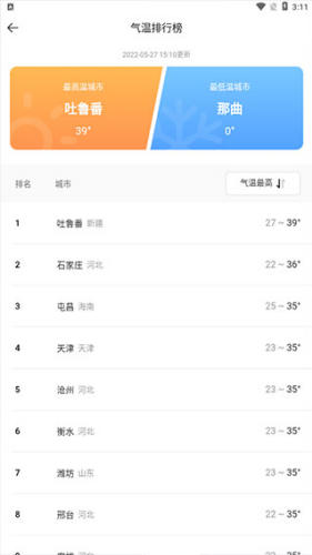 4、点击右边的气温排名能够清楚看到全国各个地区的温度排行。