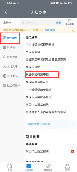 2、在人社办事的常用服务中,点击失业保险待遇申领;