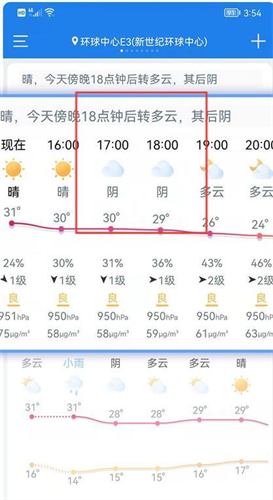 3、可以查看到逐时的天气变化的内容知晓到每个时间段的不同天气情况。