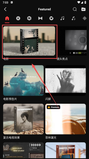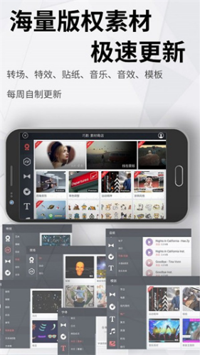 3、多视频,图片,声音,文字,特效等多个层次,让你尽情的发挥你的创造力,特效,贴纸,音效,转场,模板素材数千个