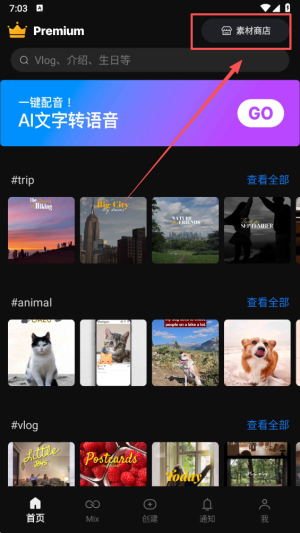 2、选择“素材商店”入口,探索丰富多样的素材资源,满足您的创作需求。