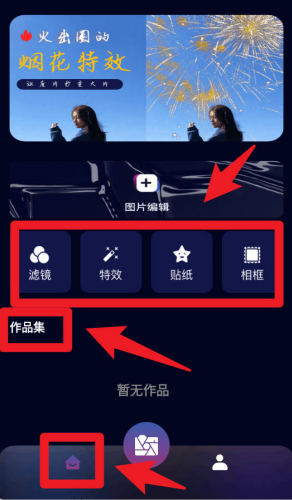 2、在首页可以使用滤镜、特效、贴纸和相框功能,还能集中管理自己的作品,方便后续编辑和分享。