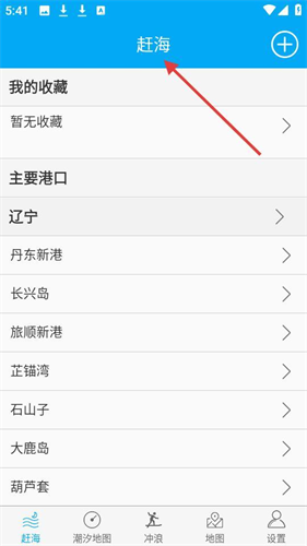 1、点击赶海应用界面,我的收藏暂无项目,列举辽宁主要港口如丹东新港等,为赶海提供地点参考。