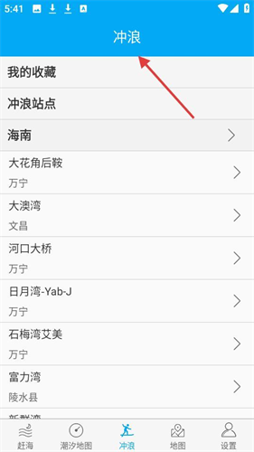 2、点击冲浪界面,我的收藏下呈现海南的大花角后鞍等冲浪站点,便于冲浪者规划行程。