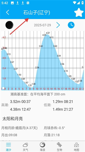 3、点击辽宁石山子的潮汐数据,含潮高、高低潮时刻及月相信息,助力用户把握赶海时机。