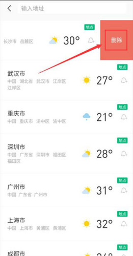 2、找到想要删掉的城市,这里以长沙为例,手指按图中所示,从右往左滑动。