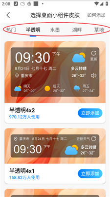 1、进入【我的天气】界面找到【选择桌面小组件皮肤】。