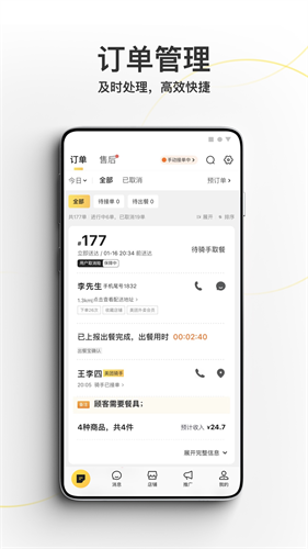 1、支持实时接单、催单处理及一键退单,配合智能订单分类与提醒功能,提升接单效率。