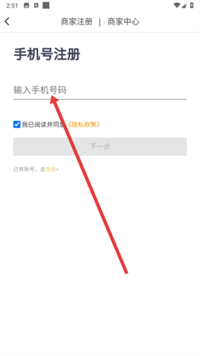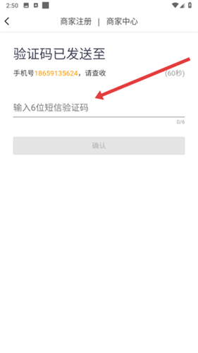 3、在商家注册页面中,点击输入框填写手机号以获取验证码。