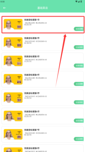 2、在第二张图课程列表中找到被红框圈住的完美音标课第1节,点击右侧的绿色观看按钮开始学习音标发音课程。