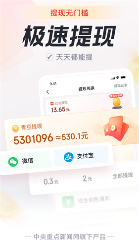 用户赚取的现金可100%当日通过微信、支付宝提现,无需等待周期,资金流转高效便捷。
