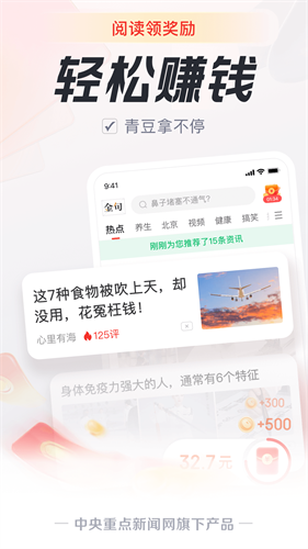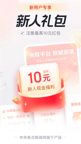首次登录中青看点可获得20元起新人现金奖励,可立即提现。