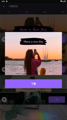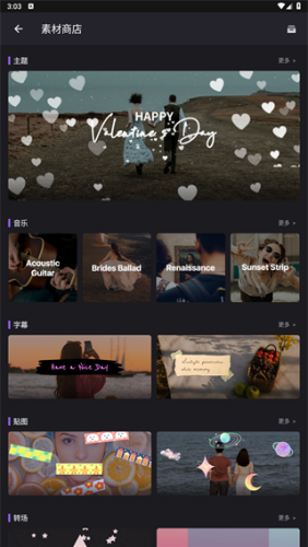 2、也可以点击素材商店,在这里找到主题、音乐、字幕等多种视频制作素材,为视频带来不一样的效果。