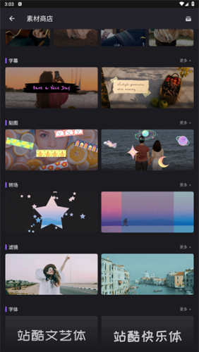 3、素材商店向下滑动还有贴图、转场、滤镜等海量素材。