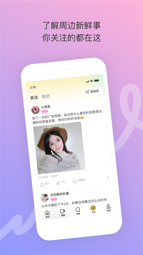 2、附近动态:用户可以分享生活瞬间,浏览附近人的动态,发现身边有趣的人和事。