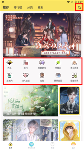 1、在本站下载丸漫app并打开,可通过搜索或是榜单推荐查找小说