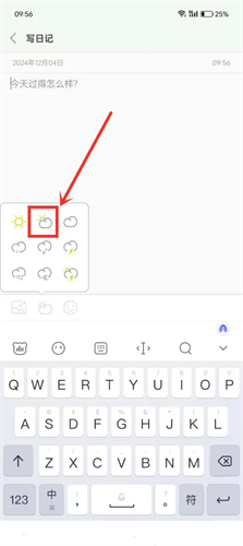 5、增加日记的天气图标展示内容,选择并点击天气图标后就能根据当天的天气选择相应的标签;