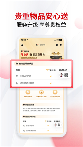 30分钟上门,同城最快1小时送达,专人直拿直送,打造顺丰高时效物流产品,为客户提供全城范围内的急速配送服务。