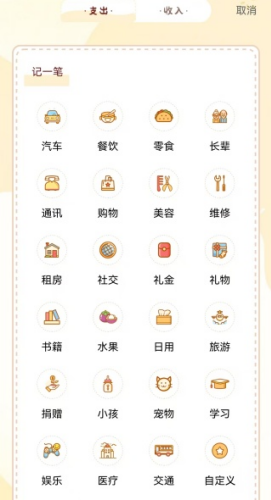 2、进入支出及收入界面,大家可以选择记录的类型,分类很详细。