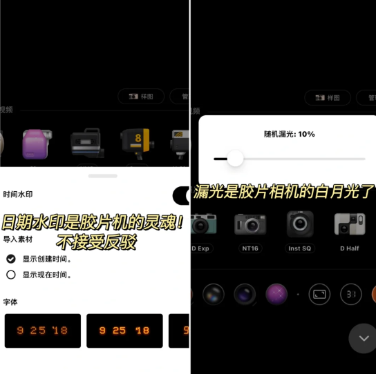 ▪️不同的胶片相机在滤镜片这一栏的最右边会有不同的一些小设置,细节满分!!从右往左第一个小圆圈是用来调画布比例的,第二个是日期水印,胶片机的特色。第三个圈圈可以选择随机漏光的概率,可以开到中间一些,恰到好处的漏光会使胶片感氛围更浓,是胶片机的灵魂啦!