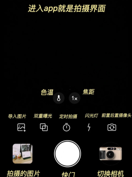 从左到右:导入图片,专治日常随手拍的废片。双重曝光,依次拍摄或导入两张图就可以get双重曝光得到的图片。延时拍摄,分别有3秒和10秒的延时。闪光灯。前置后置摄影头切换。