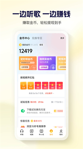 听歌、看视频、邀请好友,都能获取金币,快速提现。