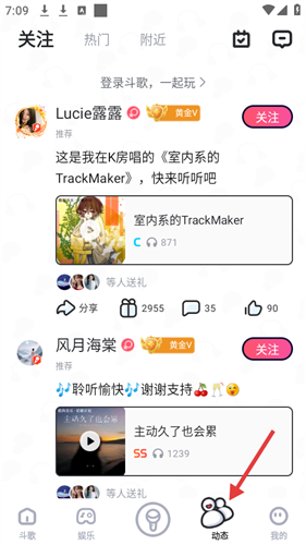 3、动态界面,展示Lucie露露等用户分享的演唱作品,附带播放量、送礼等互动信息,能进行关注等操作。