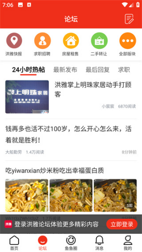 4、点击下方工具栏论坛,可以查看24小时热帖,还有招聘、房屋租赁等信息。
