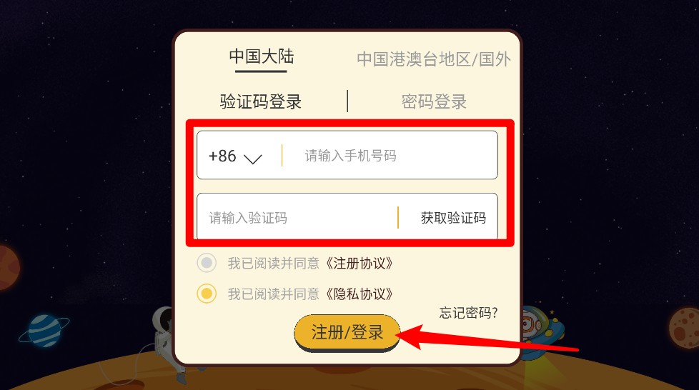 1、打开应用后输入手机号与验证码,勾选协议后点击“注册/登录”完成登录。