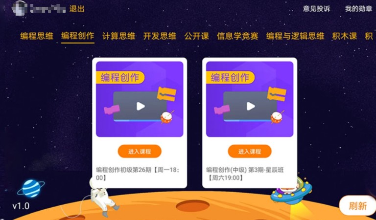 2、登录成功后点击课程模块中的“编程创作”,可选择适合的课程进入学习。