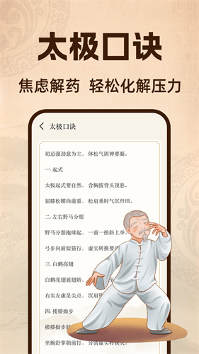 支持用户对太极口诀进行查看,有效缓解自己的身心压力,随时放松解压。