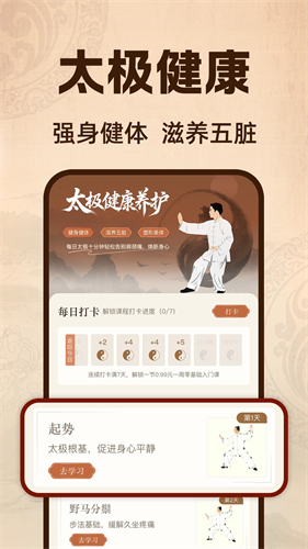 软件支持用户有效体验太极健康,就可零基础的入门练习,实时滋养自己的身心健康。