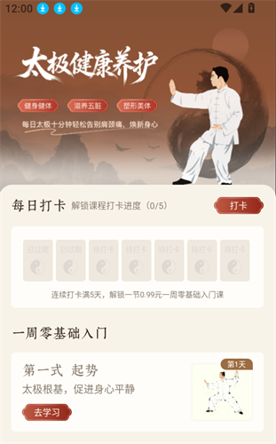 为用户提供了线上的太极养生,方便用户简化太极拳,查看详细的动作讲解,实时练习。