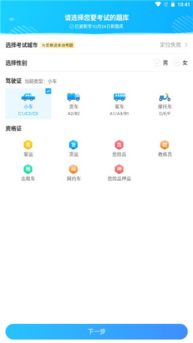1、进入软件时选择你要考试的题库,然后点击下一步。