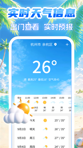 自动定位用户当前或目的地城市(如杭州市余杭区),显示实时天气(26℃晴,空气良)、当日时段预报(11:00-16:00天气变化)及未来3天天气预报(如次日26℃/35℃,多云转晴),帮助用户提前准备衣物、雨具,避免天气影响出行体验。