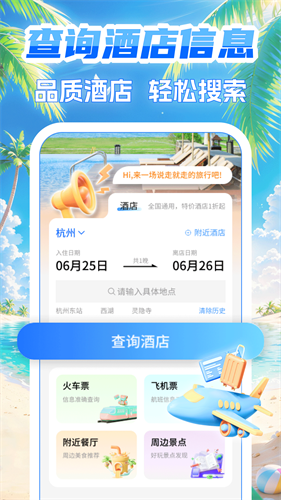 内置“火车票”“飞机票”查询入口,用户在订酒店的同时,可同步查询往返目的地的交通信息,无需切换至其他交通类APP,例如去杭州旅行时,可先查好高铁票,再直接预订杭州东站附近的酒店,简化出行规划流程。